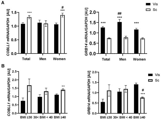 (A) COBLL1 and GRB14 mRNA expression in 524/560 paired human visceral (vis) and subcutaneous (sc) adipose tissue (AT) samples in the total cohort and grouped by sex (131/149 men, 393/411 women). Data are shown as mean ± SEM; *** for comparisons between sc and vis fat depot expression; # for comparison between men and women in the same AT depot; # p < 0.05; ## p< 0.01; *** p < 0.001. (B) COBLL1 and GRB14 mRNA expression in paired human visceral (vis) and subcutaneous (sc) adipose tissue (AT) samples grouped by obesity status (BMI < 30 kg/m2, n = 19; 30 ≤ BMI < 40 kg/m2, n = 47; BMI ≥ 40 kg/m2, n = 454). Mean ± SEM; ** sc vs. vis AT depot; # 30–40 kg/m2 ≥ 40 kg/m2 vs. <30 kg/m2 depot; # p < 0.05; ** p < 0.01; *** p < 0.001.