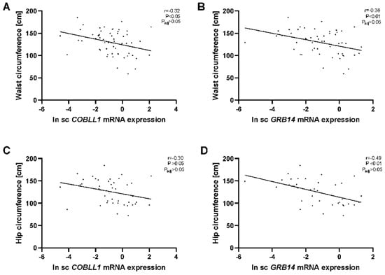 Moreover, we found a significant correlation between sc COBLL1 and GRB14 mRNA expression with waist circumference (Figure 2A,B) and that sc GRB14 mRNA correlated with hip circumference but did not correlate with sc COBLL1 expression (Figure 2C,D). However, these correlations did not withstand adjustment for BMI. On the other hand, vis COBLL1/GRB14 mRNA expression did not correlate significantly with body FD parameters.