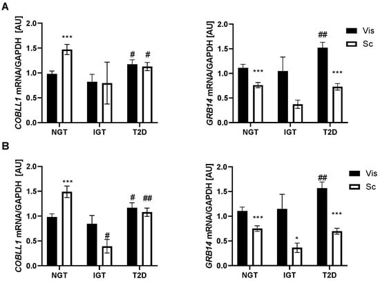 (A) COBLL1 and GRB14 mRNA expression in paired human visceral (vis) and subcutaneous (sc) adipose tissue (AT) samples grouped by type 2 diabetes status (NGT: subjects with normal glucose tolerance, n = 238; IGT: subjects with impaired glucose tolerance, n = 10; subjects with Type 2 diabetes, n = 197). Mean ± SEM; *vis vs. sc AT depot; #IGT/T2D vs. NGT; # p < 0.05; ## p < 0.01; *** p < 0.001. (B) COBLL1 and GRB14 mRNA in paired human visceral (vis) and subcutaneous (sc) adipose tissue (AT) samples grouped by type 2 diabetes status in BMI ≥ 40 kg/m2 patients. (NGT: subjects with normal glucose tolerance, n = 200; IGT: subjects with impaired glucose tolerance, n = 9; T2D: subjects with diabetes, n = 175). Mean ± SEM; *vis vs. sc AT depot; #IGT/T2D vs. NGT; */# p < 0.05; ## p < 0.01; *** p < 0.001.