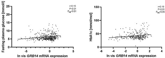 We analyzed the association between COBLL1 and GRB14 mRNA expression and metabolic phenotypes, including diabetes, lipid, and inflammatory parameters, as well as adipokines (Table S1). We found that vis GRB14 mRNA expression was correlated positively with glycated haemoglobin (HbA1c) and fasting plasma glucose (FPG) (Figure 4), even in multiple linear regression models after adjusting for age, sex, and BMI (padj < 0.05; Table S1). Sc GRB14 mRNA expression was not significantly correlated with glucose variables. On the other hand, there was no significant association between COBLL1 mRNA expression and the phenotypes studied in both AT (Table S1).