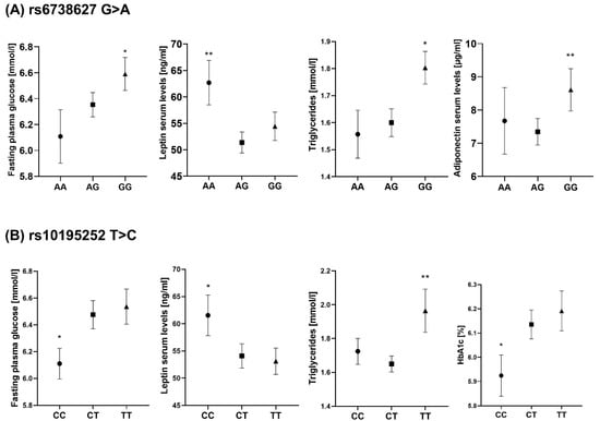 Association analyses of rs6738627 and rs10195252 with metabolic traits. (A) Association analyses of rs6738627 with FPG, leptin, TG, and adiponectin. (B) Association analyses of rs10195252 with FPG, leptin, TG, and HbA1c. * p < 0.05; ** p < 0.01; p adjusted for sex, age, and BMI.