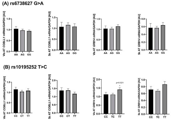 Association of rs6738627 and rs10195252 with COBLL1 and GRB14 mRNA expression in visceral (vis) and subcutaneous (sc) AT. (A) shows the rs6738627 associated with COBLL1 and GRB14 mRNA expression in both ATs. (B) shows the rs10195252 associated with COBLL1 and GRB14 mRNA expression in both ATs. Data are given as arithmetic mean ± SEM; p < 0.05 in additive mode of inheritance; adjusted for sex, age, BMI.