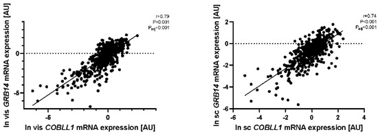 We applied mediation analyses between SNP, gene expression, and several obesity and metabolic traits. Mediation analyses revealed that the association between rs10195252 and HbA1c was fully mediated via vis GRB14 gene expression (p < 0.05, Table S4). Although rs10195252 was associated with FPG, this appeared to be driven by other factors, as no significant association was found when GRB14 mRNA expression was the mediating variable (p > 0.05, adjusted for sex, age, and BMI). Notably, COBLL1 and GRB14 mRNA expression were strongly correlated in both AT (Figure 7, Table S5). Although rs10195252 was not significantly associated with COBLL1 mRNA expression in vis AT, mediation analyses revealed that rs10195252 had a significant direct effect on COBLL1 expression (ß = −0.1496, p = 0.0057, adjusted for sex, age, and BMI). This may be due to the indirect effect from GRB14 partially suppressing the direct effect of the SNP on COBLL1 gene expression. On the other hand, the SNP also had a significant indirect effect on GRB14 transcript levels, but not through COBLL1 mRNA expression (p > 0.05, adjusted for sex, age, and BMI).