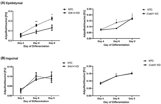 Adipose tissue of newborn FVB mice was extracted and immortalized using the SV40 T antigen as described in detail elsewhere []. These immortalized epididymal and inguinal adipocytes were cultured and differentiated according to the reported protocols [,]. Epididymal fat was considered as the visceral adipose depot and inguinal was considered as the subcutaneous fat depot. Shortly, cells were grown in Dulbecco’s modified Eagle’s medium (high glucose) supplemented 20% fetal bovine serum at 37 °C and 5% CO2 until reaching 80% confluence. Three days prior to induction, electroporation transfection of siRNA into the cell was performed using Neon® Transfection System. Subsequently, induction was initiated by adding 0.125 mM indomethacine, 2 µg/mL dexamethasone, and 0.5 mM isobutylmethylxanthine to the growth medium for 24 h and for differentiation; growth medium was supplemented with 20 mM insulin and 1 nM triiodthyronine. A second chemical transfection method was perfomed one day after the induction. In this case, the transfection Reagent DharmaFECT® was used. Cells were grown for 8 days in differentiation medium. Thus, cells were harvested at time point: 80% confluence (=day−2), day 0 (=day of induction), day 2, 4, 6, 8 (=2, 4, 6, 8 days after induction), and washed and frozen immediately at −80 °C until RNA or protein extraction. All differentiation lines were run in triplicate. Adipocyte differentiation and lipid droplet accumulation was monitored by AdipoRedTM staining (Lonza, Basel Switzerland); siRNA for Grb14 (Horizon, Catalog ID: L-044828-00-0005), Cobll1 (Horizon, Catalog ID: L-051032-01-0005), and a negative control (ON-TARGETplus Non-Targeting Pool, Horizon, Catalog ID: D-001810-10-20) were used. Grb14 and Cobll1 knock-downs were validated at mRNA and protein level. The mRNA knockdown efficiency was 40% and 50% knock-down in inguinal and epididymal, respectively (Figure S1).