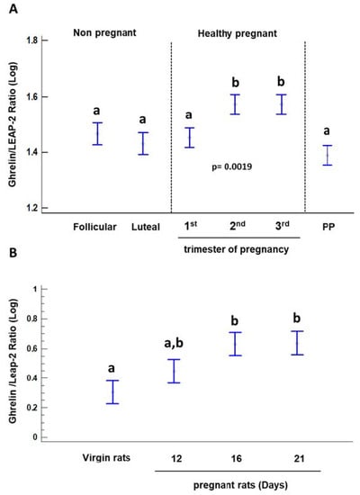 The Ghrelin/LEAP-2 ratio (Log) in healthy pregnant women at each trimester of gestation and during the follicular and luteal phases of the menstrual cycle (A) and Ghrelin/LEAP-2 ratio during pregnancy in rat (B). A p value of < 0.05 was considered as statistically significant. Mean Log [(Ghrelin ng/mL) × 10)]/Log [(LEAP-2 ng/mL) × 10] were used. Bars with no common letters are significantly different (p < 0.05).