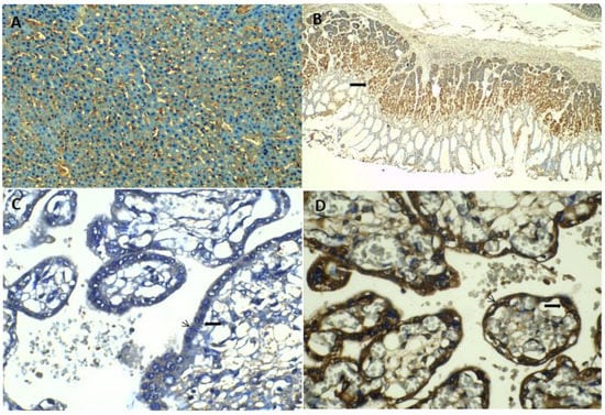 Human LEAP-2 was visualized by immunohistochemistry in liver tissue and cytotrophoblast and syncytiotrophoblast of the human term placenta (Figure 2A,C). Additionally, immunostaining for human ghrelin was detected in gastric glandular cells, cytotrophoblast and syncytiotrophoblast of the human term placenta (Figure 2B,D).