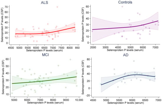 Figure 1 reports the results of spline regression analysis to assess the associations between CSF and serum selenoprotein P levels, after adjusting for age and sex. Such levels were positively and nearly linearly correlated in each study subgroup, except for patients with AD, for whom, an inverted U-shaped association emerged, with a positive association until 6000 ng/mL of serum levels, then followed by a slight decrease. In multivariable linear regression analysis, the β coefficient was 0.003 (95% CI 0, 0.007), 0.002 (−0.001, 0.004), 0.003 (−0.004, 0.011) and 0.003 (−0.001, 0.007) in the ALS, MCI, AD and control group, respectively.