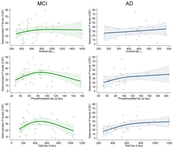 Patterns for p-tau181 and t-tau levels in relation with selenoprotein P were substantially similar in the AD group, while in the MCI one, at high levels of both neurodegeneration biomarkers, we found an inverted-U-shaped pattern with turning points at around 80 and 500 ng/L of p-tau181 and t-tau, respectively.
