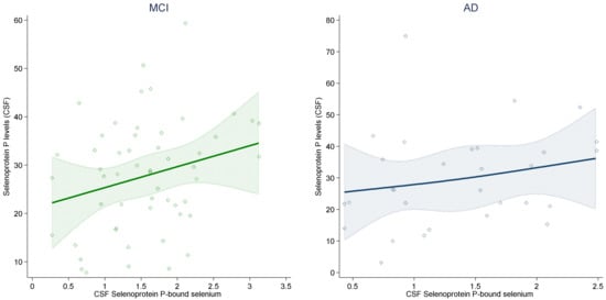For all individuals diagnosed with AD and MCI subjects, we could also rely on CSF selenoprotein-P-bound selenium levels from a recent cohort study assessing whether the central nervous system selenium status could influence MCI progression to dementia []. In that study, inductively coupled plasma dynamic reaction cell mass spectrometry was used to determine the amount of selenium bound to selenoprotein P in CSF.