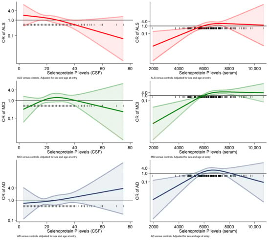 Conversely, the association between CSF selenoprotein P levels and both AD and MCI risk was positive, while the corresponding risk estimates for serum selenoprotein P levels were much attenuated and close to unity. In the spline regression analysis (Figure 4), the relation between CSF selenoprotein P and risk was roughly linear over the entire range of exposure tested for both ALS and AD, although in the opposite direction (negative for the former and positive for the latter), while the pattern for MCI risk was inconsistent, showing an inverted-U-shaped pattern.