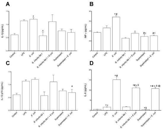 Cytokine levels in the culture medium of Caco-2 cells after 8 h of treatments. (A) IL-1β. (B) IFN-γ. (C) IL-12 p70. (D) IL-6. (E) IL-8. (F) TNFα. (G) IL-10. (H) IL-4. Results are expressed in pg/mL as the mean ± SEM of three independent experiments. * p < 0.05 vs. control (untreated cells); # p < 0.05 vs. LPS; + p < 0.05 vs. E. coli; $ p < 0.01 vs. B. infantis IM-1®; & p < 0.01 vs. B. infantis IM-1® + E. coli; @ p < 0.001 vs. supernatant.