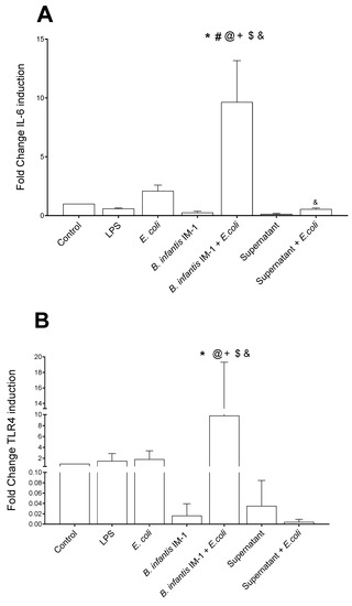 Expression of IL-6 (A), TLR-4 (B) and occludin (C) genes by Caco-2 cells determined by qRT-PCR. Results are expressed as the mean ± SEM of three independent experiments. Changes in gene expression are expressed as fold change versus unstimulated Caco-2 cells. * p < 0.05 vs. control (untreated cells); # p < 0.05 vs. LPS; + p < 0.05 vs. E. coli; $ p < 0.01 vs. B. infantis IM-1®; & p < 0.01 vs. B. infantis IM-1® + E.coli; @ p < 0.001 vs. supernatant.