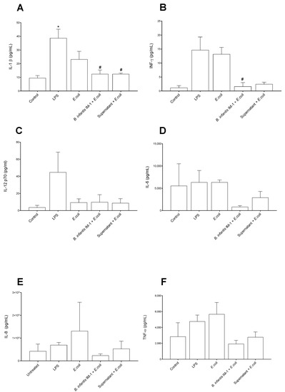 Caco-2 cells were cultured in Dulbecco’s modified Eagle’s medium (DMEM) (Sigma-Aldrich) supplemented with 10% inactivated FBS, 1% glutamine, penicillin G (0.1 U/mL) and streptomycin (0.1 mg/mL). The cells were cultured at 37 °C in an atmosphere of 5% CO2 and 95% air. Caco-2 cells were stimulated with E. coli CECT 515 for 4 or 8 h. LPS at 60 ng/mL (Sigma-Aldrich) was used as a positive control. We used 1 Caco-2 cell per 100 E. coli cells and 1 Caco-2 cell per 30 probiotic cells.