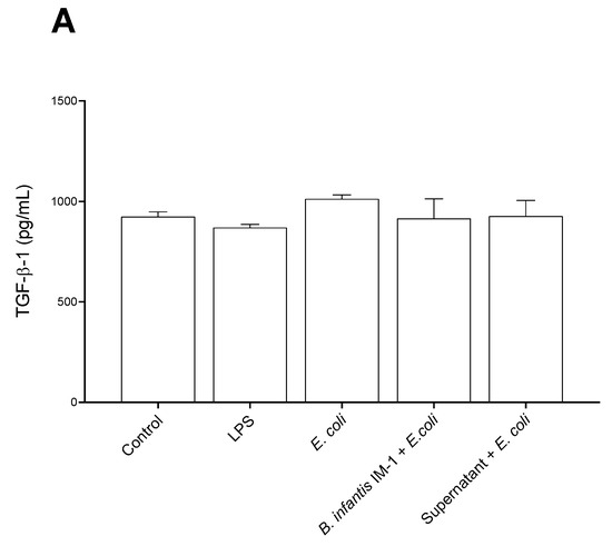 Unlike the single cultures of Caco-2 cells, in co-cultures of Caco-2 plus DCs, the strongest pro-inflammatory effects in cytokine secretion were observed with LPS and not with E. coli CECT 515 (Figure 5). Treatment of the co-cultures with B. infantis IM-1® or its supernatant together with E. coli CECT 515 resulted in reductions in IL-1β and IFN-γ, compared with the LPS-treated co-cultures (Figure 5A,B). Comparisons with E. coli CECT 515-treated co-cultures did not reach statistical significance. Similar trends were observed for IL-6, IL-8 and TNF-α (Figure 5D–F). No changes whatsoever occurred in TGF-β levels (Figure 6).