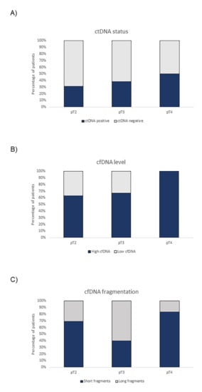 When analyzing these four mutations in ctDNA at baseline, we found a 65% mutation concordance between ctDNA and matched tumor tissue. On the other hand, at least one of the four mutations was found in 66% (23/35) of cfDNA samples at cystectomy; TERT c.-124C>T, TERT c.-146C>T, ATM c.1236-2A>T and TP53 c.853G>A mutations were found in 64% (16/25), 40% (2/5), 38% (6/16) and 100% (6/6) of ctDNA samples analyzed at baseline, respectively. At this time, ctDNA status and cfDNA levels were associated with the pathological stage of MIBC patients; the higher pT stage tended to present more ctDNA positive samples and higher cfDNA levels (Figure 1A,B). Contrarily, cfDNA fragmentation did not show any clear association with the pathological stage (Figure 1C).