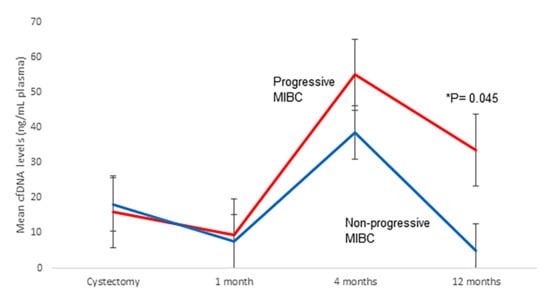 When dividing patients according to progression and death status, we found that the mean MAF of TERT c.-124C>T was significantly higher in progressive than in non-progressive MIBC patients and in those patients who died due to BC 4 and 12 months after RC (Figure S2). Furthermore, mean cfDNA levels 12 months after RC were significantly higher in progressive than in non-progressive MIBC patients (p = 0.045; Figure 2). No significant differences were found in the mean cfDNA fragment size of MIBC patients (Table S1) or mean MAF for the remaining mutations (Table S2) according to tumor progression and death occurrence.