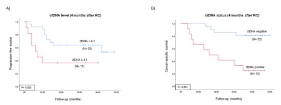 We assessed changes in ctDNA status at baseline and four months later. We showed that patients’ molecular response, understood as plasma ctDNA clearance four months after RC, was associated with better outcomes. Shohdy et al. [] also demonstrated that ctDNA clearance after adjuvant therapy was associated with longer survival in advanced BC patients, and Magbanua et al. [] found a similar result in breast cancer patients. Moreover, Yang et al. [] found that lung cancer patients with negative ctDNA status had better outcomes than those with positive ctDNA status after therapy. By contrast, we found that the appearance of ctDNA in plasma four months after RC in those BC patients that were ctDNA-negative at baseline was associated with poor prognosis, emphasizing that the emergence of ctDNA after RC could be considered a sign of tumor aggressiveness. A similar result was obtained by Tie et al. [], who found that ctDNA positivity after treatment in colon cancer patients was associated with poorer outcomes.