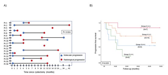 ctDNA status analysis. (A) Time of progression according to changes in ctDNA status (molecular progression) and imaging techniques (radiological progression); and (B) Kaplan–Meier curve for tumor progression in four different MIBC groups stratified by changes in ctDNA status between baseline and four months after RC (Group 1: patients with positive ctDNA status at both time points; Group 2: patients with positive ctDNA status at baseline and negative ctDNA status four months after RC; Group 3: patients with negative ctDNA status at baseline but positive ctDNA status after RC; Group 4: patients with negative ctDNA status at baseline and later). Abbreviations: Pt; patient.