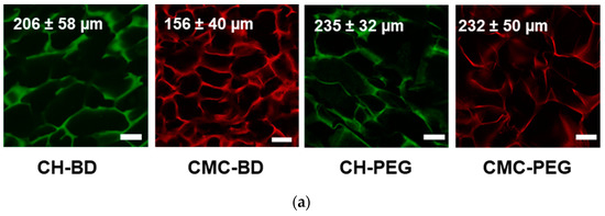 The FTIR spectra of chitosan and CMC cryogels cross-linked with BDDGE and PEGDGE, in comparison with the original polymers (Figure S2, Supplementary Materials), showed an increase in the relative intensity of the peak at ~1000–1200 cm−1, attributable to the C−OH and C−O−C bonds [34,35], and at 3000–3600 cm−1 belonging to the hydroxyl groups and water bound to PEG and BD blocks. The higher relative intensity of this broad peak for the CH-PEG and CMC-PEG cryogels confirms the high efficiency of PEGDGE as a cross-linker and higher hydrophilicity of these scaffolds. It should be also mentioned that peaks at ≈911 and 839 cm−1 characteristic for the epoxy ring [10] were not detected.