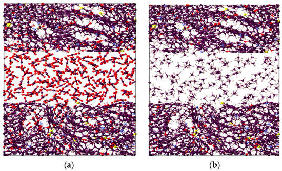 A few previous MD simulation studies [,] have been carried out to develop the condensed kerogen using a large-scale atomic/molecular massively parallel simulator (LAMMPS) []. Polymer-consistent forcefield plus (pcff++) was used in molecular dynamics []; it describes atom dispersion/repulsion (Lennard–Jones potential 6–9), intermolecular, and electrostatic interactions and has been recognized as a reliable forcefield for thermodynamic characteristics [,].