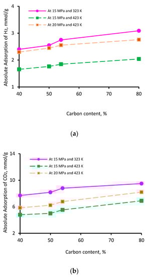 Thus, it was confirmed that highly mature kerogen mainly adsorbs more gas, preferably CO2 over CH4 and H2, while immature kerogen (II-A: carbon content = 40%) showed the lowest adsorption capacity. These results suggest a positive correlation between kerogen maturity and the adsorption capacity of gases. These observations are consistent with previous findings on CO2 and CH4 adsorption onto shale surfaces [,,]. A recent investigation by Arif et al. [] also found a consistent increase in H2 adsorption in coals with increasing carbon content [].
