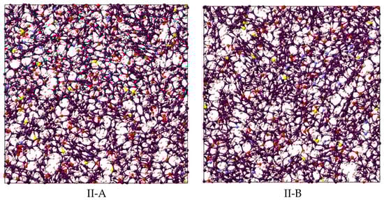 The chemical composition and physical properties of kerogen structures were in good agreement with the experimental data (e.g., X-ray and Nuclear Magnetic Resonance) [], and the percentage of aromatic fixed carbon demonstrated a trend: the lowest aromatic carbon in II-A and highest in II-D kerogen. Thus, the kerogen maturity and porosity were in the order of II-D(overmature) > II-C(Middle and End Oil Window) > II-B(Top of Oil Window) > II-A(immature). The pores size distribution demonstrated that II-D contained the largest micropores, followed by II-C, II-B, and II-A in descending order.