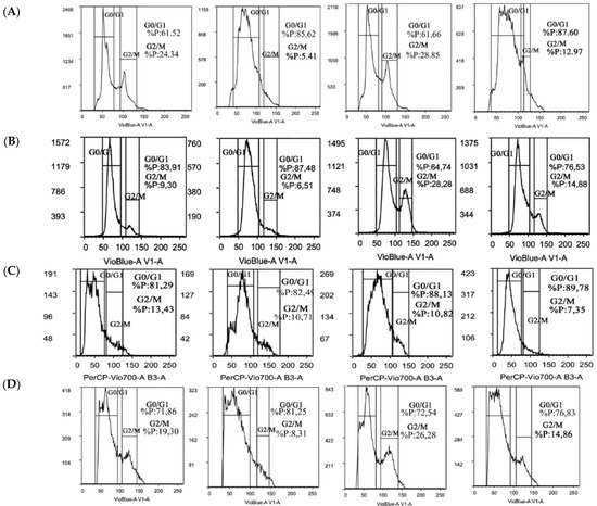 Cells were synchronized by starvation with serum-free medium in the 24 h preceding irradiation. Then, cells were pre-treated with trabectedin and/or irradiated to a dose of 4 Gy. After 24 h, cells were harvested by trypsinization and re-suspended in 0.3% BSA PBS wash buffer. FS, RS, and LPS to a density of 5 × 105 cells were fixed with 2% formaldehyde and then stained with DAPI Nuclear Stain. LMS cells were resuspended to a density of 1 × 105 cells/mL in 0.3% BSA PBS wash buffer, then fixed in cold 70% ethanol for 1 h at 4 °C, and stained with 50 μg/mL of PI and 100 μg/mL of ribonuclease RNase, to ensure only DNA staining. Stained cells were analyzed using a MACSQuant Analyzer 10 benchtop flow cytometer (Miltenyi Biotec) according to the manufacturer’s instructions.