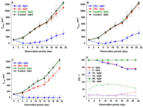 In the studies on immunodeficient nu/nu mice with PC-3 human prostate adenocarcinoma xenografts, the photoinduced antitumor activity of NHC-derived dipropoxy-BPI with histamine (7b) and its metal complex with Au(I) (8b) was estimated in comparison with that of dipropoxy-BPI (5). At the beginning of treatment, the tumor size was 110 ± 10 mm3. A PS was administered once, intravenously at a dose of 1.0 mg/kg, based on the active ingredient (dipropoxy-BPI). The results of these studies are presented in Figure 5. All the compounds were shown to have high antitumor activity. Compounds 7b and 5 were shown to have similar antitumor effects: the inhibition of tumor growth (ITG) was 76–100% and 75–100%, respectively; the number of remissions (NR) was 30% and 50%, respectively. A higher antitumor effect was observed with the Au(I) metal complex 8b as the PS: ITG = 100%, NR = 100%. On the one hand, it is due to the presence in the drug molecule of a long-wave PS (dipropoxy-BPI) modified by histamine that is capable of binding to the corresponding receptors of PC-3 adenocarcinoma, and on the other hand, to the presence of Au(I) as a chemotherapeutic agent. The use of compound 8b in mice with PC-3 xenografts without light exposure resulted in an insignificant inhibition of tumor growth: ITG varied from 20 to 35% (the differences from the control group were biologically significant between days 7 and 21).