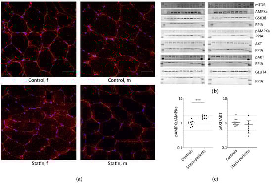 The translocation of GLUT4 is mediated either by AKT via insulin stimulation or AMPK activation via contraction. The AKT/mTOR pathway is essential for skeletal-muscle cell regeneration. We further analyzed AMPKα, phosphorylated AMPKα, AKT, phosphorylated AKT, GSK3ß, and mTOR which are known to be involved in glucose metabolism (Figure 1b,c). As is known, AMPKα is phosphorylated and activated by several factors, i.e., insulin, leptin, calcium changes, or muscle contraction. Total AMPKα levels were not differentially expressed between statin patients and controls, but we found a statistically significant increase in phosphorylated AMPKα in statin-treated patients of 77% (Figure 1b–d). Phosphorylated AKT blocks AMPKα activity. The total AKT levels were significantly higher in statin-treated patients, whereas phosphorylated AKT levels were lower and consequently 22% less at activated state (Figure 1b–d). Activated AKT inhibits GSK3ß by phosphorylation, whereas mTOR activates GSK3ß, which is necessary for glycogen synthesis. The mTOR levels were slightly increased and GSK3ß levels were not different in statin-treated patients compared with controls (Figure 1b,c).