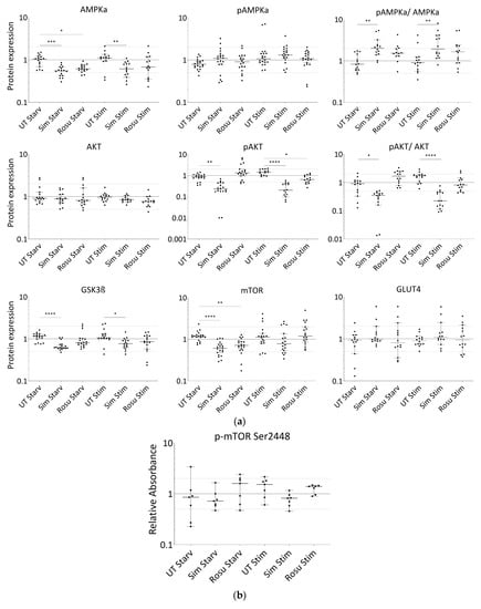 Expression of proteins relevant for glucose-uptake regulation and metabolism in human primary myotubes non-stimulated and stimulated with glucose and insulin under statin treatment. (a). Relative expression level of proteins relevant for glucose uptake regulation and metabolism under statin-treatment compared to its untreated control w/o glucose and insulin stimulation. Ratios of pAMPKα and pAKT to total AMPKα and AKT protein, respectively to control for differences in total protein levels. (b). mTOR phosphorylation at Ser2448 was detected using sandwich ELISA method. Values are protein level corrected. (c–i). Western blot of statin-treated human primary myotubes unstimulated and stimulated with insulin and glucose. PPIA and GAPDH were used as reference proteins. mTOR, AMPKα, and GSK3ß were probed on the same blot. Phosphorylated AMPKα, AKT, and phosphorylated AKT were analyzed on separate immunoblots. GLUT4 was probed on the same membrane as phosphorylated AMPKα. Signals shown are derived using an LI-COR-Odyssey infra-red scanner, except for GLUT4, and quantified via Image Studio Lite ver5.2. Protein ladder lanes separate each myotube cell line data set (C = C11; D = C5; E = C12; F = C4; G = C3; H = C10; I = S8; see Table 1). Each data set includes untreated, DMSO, simvastatin, rosuvastatin non-stimulated and stimulated with glucose and insulin, respectively. Western blotting was repeated twice. (Results obtained from C3–C5, C10–C12, and S8; see Table 1; GAPDH–bands derived with ECL method only) [UT = untreated; Sim = simvastatin; Rosu = rosuvastatin; Starv = starving condition only; Stim = insulin/glucose stimulation after starving; dotted line at 2- and 0.5-fold; * p < 0.05, ** p < 0.005; *** p < 0.0005, **** p < 0.00005; one-way ANOVA corrected for Dunn’s multiple comparison testing; plots show single data points with 95% confidence interval for the median].