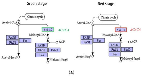 Differences in gene expression of genes related to fatty acid metabolism. Red indicates upregulation and green indicates downregulation. Note: only partial metabolic pathways are shown, the same below. (a) Acetyl-CoA carboxylase gene (ACACA), green stage on the left and red stage on the right; (b) stearoyl-CoA desaturase gene (SAD).