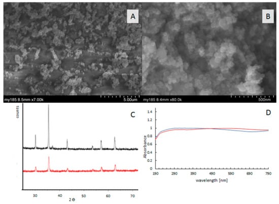 The catalysts’ characterization. SEM images of Fe3O4 micro-size (A) and nano-size (B). X-ray diffraction measurements of μ-Fe3O4 (black), n-Fe3O4 (red) and (C), UV−VIS absorption spectra of μ-Fe3O4 (red) and n-Fe3O4 (blue) (D).