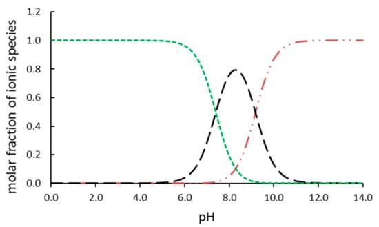 In our study, TBBPA was removed from the reaction mixtures in two different processes listed in Table 1. The reactions were conducted in aqueous solutions at pH = 8. At these conditions, TBBPA exists in three different forms, including the molecular form and two dissociated forms. The simulated (using pKa of compounds and Curtipot software []) percentage molar fraction of ionic forms at pH = 8 is: TBBPA—20%, TBBPA−—75%, and TBBPA2−—5% (Figure 2). The decay of TBBPA in the time suggests that the ionic composition of the substrate improves the photocatalytic degradation, whereas it hinders the reaction with hydroxyl radicals. The removal efficiency (Figure 3B) shows the excellent effectiveness of photocatalysis compared to ozonolysis.