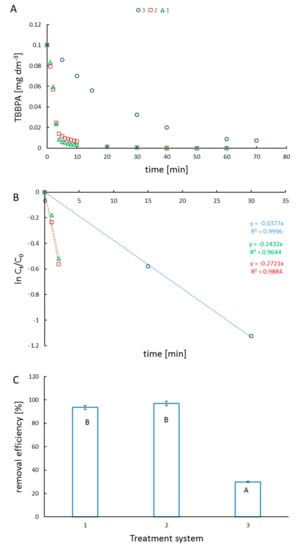 TBBPA decay rate in different degradation systems (A) (treatment system 1—triangles, 2—squares, 3—circles); plot of ln (Ct/C0) vs. irradiation time (B); removal efficiency in used degradation systems (description in Table 1) (C). On the figure removal efficiency ± SD, n = 3 was given, statistical (p < 0.01) differences between the degradation methods, assessed by Statistica 13.1 Student’s test, are indicated by different letters.
