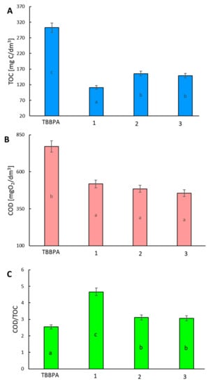 Concentration of organic compounds in solutions of raw TBBPA and products of AOP treatment expressed as a total organic carbon (TOC) (A), chemical oxygen demand (COD) (B), and TOC/COD ratio (C). The mean value ± SD, n = 3 of the result was presented, statistical (p < 0.01) differences between the results, assessed by Statistica 13.1 Student’s test, are indicated by different letters.