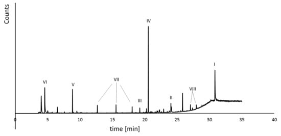 Exemplary GC-MS analysis of the reaction mixture, where I—TBBPA; II—BPA; III—3,5-dibromo-4-hydroxybenzoic acid; IV—2,6-dibromo-4-isopropylphenol; V—2,6-dibromo-4-methylphenol; VI—DMSO; VII—aliphatic carboxylic acids; VIII—tri-, di-, mono-bromobisphenol A.