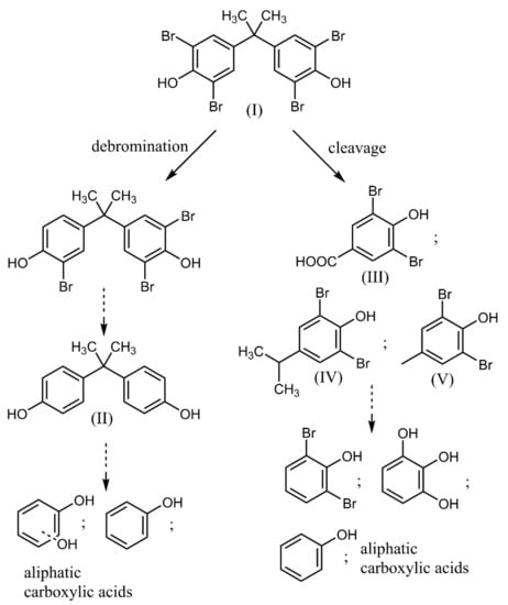 The common existence (even in household dust) and the risky transformation of TBBPA and BPA in the environment have attracted the attention of researchers around the world in recent years [,]. The study of TBBPA degradation processes and the toxicity of the by-products is extremely important because of its highest production volume out of all BFRs in the world. The TBBPA market size is forecasted to reach $3.5 billion by 2025 []. Under natural conditions, the degradation of TBBPA seems to be problematic. Water and soil contamination removal techniques usually require complex procedures, whereas thermal treatment is a classic approach to TBBPA decomposition []. One of the major drawbacks of TBBPA combustion or pyrolysis relies on highly toxic PBDDs (dibromodichlorodibenzo-p-dioxins) and PBDFs (dibromodichlorodibenzofurans) []. In contrast, advanced oxidation processes, such as ozonolysis or photocatalysis, have been considered as a promising technique for TBBPA degradation, free of the above-mentioned drawbacks. Ozonolysis leads to the almost complete removal of bromine from TBBPA and the formation of BPA. This process may occur directly in the atmosphere and water solutions []. Unfortunately, the formation of BPA during the process is a serious disadvantage. BPA is a genuine threat to living species, not only due to their estrogenic activity, but also because of adverse effects such as genotoxicity and carcinogenicity. Whereas the photocatalysis process causes disruption of TBBPA and the formation of small-molecule compounds.