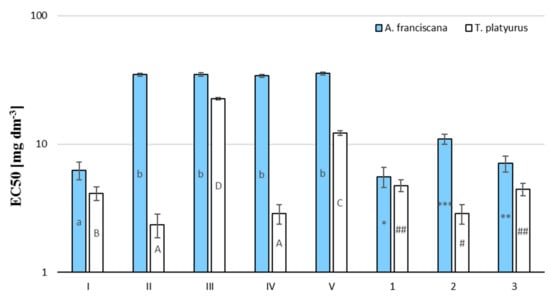 Mean 24 h EC50 values of the investigated compounds and post-reaction mixtures for A. franciscana (blue) and T. platyurus (white). The mean value ± SD, n = 3 of the result was presented, statistical (p < 0.01) differences between the results, assessed by Statistica 13.1 Student’s test, are indicated by different small letters for A. franciscana, capital letters for T. platyurus, number of *, **, *** for post-reaction mixtures tested on A. franciscana, number of #, ## for post-reaction mixtures tested on T. platyurus, difference at p < 0.05.