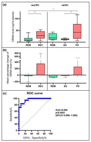 The diagnostic power of cfDNA. (a) Mean cfDNA amount (ng/mL plasma) in the plasma of CRC patient subgroups. Significantly different (* p < 0.05) cfDNA levels were noticed comparing recurrence (REC) and progressive disease (PD) vs. remission (REM) cases and progressive disease vs. stable disease (SD) among patients with metastatic CRC. (b) The mean percentage change (%) of cfDNA from first to last sample collection in the different CRC subgroups. Significant (* p < 0.05) cfDNA level elevation was observed in the case of PD between the first and last sample collection time, while an opposite trend was described in individuals with REM. (c) ROC curve analysis of cfDNA amount measured at study end indicated a sensitivity of 83% and specificity of 94% (AUC = 0.956, 95%CI 0.906–1.000, p < 0.0001) for the discrimination between individuals achieving remission and patients showing tumor progression.