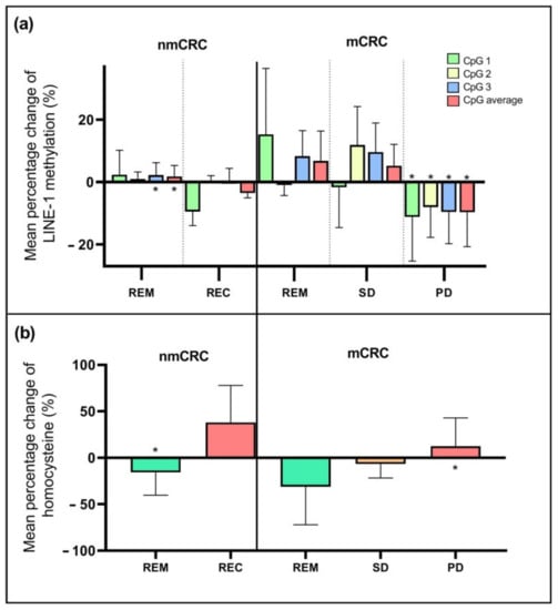 Examination of LINE-1 methylation and homocysteine level in plasma samples. (a) Mean percentage change (%) of LINE-1 methylation per CpG positions separately and their average from the first to the last sample collection in CRC patients with different treatment responses. In the case of progressive disease, the hypomethylation of both separate CpG sites and their average was observed, while in nmCRC patients with remission, increased DNA methylation was recognized (* p < 0.05). (b) Mean percentage change of homocysteine amount (%) from the beginning to the end of our study in CRC subgroups. The homocysteine level of the PD patients showed an elevation; in contrast, in the case of remission, a reduction was identified (* p < 0.05).