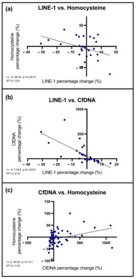 Correlation analyses of LINE-1 methylation status, homocysteine, and cfDNA levels. (a,b) A negative correlation was detected between the percentage change of mean LINE-1 methylation vs. homocysteine and cfDNA level. (c) A positive correlation was noticed comparing cfDNA and homocysteine percentage change.