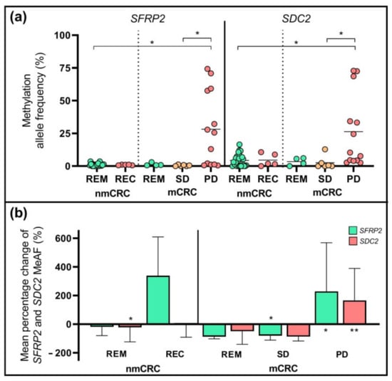Methylation allele frequencies (MeAF) of SFRP2 and SDC2 genes. (a) The MeAF of SFRP2 and SDC2 at the time of last samples collection (* p < 0.05). (b) The mean percentage changes of MeAF between the beginning and end of the study. The SFRP2 MeAF was significantly decreased in the case of stable disease, while increased in PD. In the case of SDC2, a reduction was observed in the nmCRC REM subgroup and a rise in the PD set (* p < 0.05, ** p < 0.005).