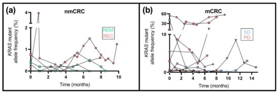 The longitudinal assessment of mutant allele frequency of the KRAS gene in non-metastatic and metastatic CRC patients. (a) In the nmCRC subgroup, the MAF was lower than 0.5% in all plasma specimens of patients with tumor remission; in contrast, a moderately higher MAF was detected in the case of recurrence. (b) In the case of metastatic CRC, all the individuals achieving remission had wild-type KRAS. Patients with progressive disease showed significantly (p < 0.05) higher average MAF than patients with stable disease.