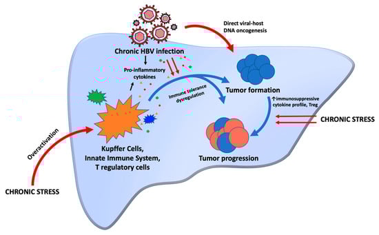 Chronic stress can lead to immune system overactivation, which in combination with chronic HBV infection, leads to immune tolerance dysregulation. Pro-inflammatory cytokines released by immune cells in response to chronic stress and chronic HBV infection also contribute to tolerance dysregulation. This helps tumors to form. HBV DNA also directly integrates into host DNA, another oncogenic mechanism in the formation of tumors. Once a tumor is formed, chronic stress can also switch cytokine profiles to more immunosuppressive ones that allow for the tumor to progress.