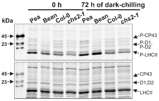Our previous report showed that dark-chilling treatment induces an opposite response in LHCII phosphorylation patterns in plants with different chilling tolerance []. In chilling-tolerant (CT) garden pea (Pisum sativum), we observed a decrease in LHCII phosphorylation after five days of dark-chilling, while in chilling-sensitive (CS) runner bean (Phaseolus coccineus), a high increase in LHCII phosphorylation was registered.