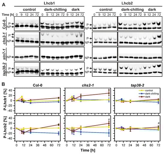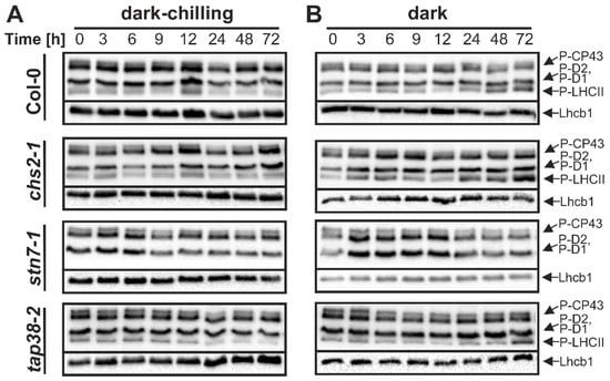 In our previous research, we showed that dark-chilling induces an increase in LHCII phosphorylation in chilling-sensitive (CS) runner bean but not in chilling-tolerant (CT) pea []. Here, we observed a similar correlation between chilling sensitivity and LHCII phosphorylation status for CT wild-type Arabidopsis (Col-0) and CS chs2-1 mutant (Figure 1). Compared with the level from the start of the experiment 0 h (i.e., after 16 h night period), after 72 h of dark-chilling exposure, LHCII phosphorylation increased by 21% in CS chs2-1, while in CT Col-0 decreased by 29%. (Figure 1). Hence, we decided to examine whether disturbances in the LHCII phosphorylation process will influence Arabidopsis chilling tolerance using phosphorylation-related mutants: stn7-1 and tap38-2, lacking LHCII phosphorylation and dephosphorylation enzyme, respectively.