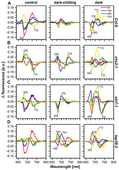 Under control conditions in all examined lines, we observed similar changes in the difference spectra, i.e., the decrease in 680 nm and the increase in 735 nm bands (Figure 4 and Figure S2). However, the chs2-1 plants exhibited a distinct pattern of difference emission spectra after 9 and 12 h, indicating different CP complexes organization after day period compared with other lines (Figure 4, left panels). No significant differences in CP complexes organization were observed under dark-chilling conditions in Col-0 (Figure 4A, middle panel). Contrarily, dark exposure induced a decrease in fluorescence at 680 nm (9 h, 72 h), 685 nm (24 h, 72 h), and 735 nm (72 h) with a simultaneous increase in fluorescence at 700 nm (9 h) and 715 nm (72 h) (Figure 4A, right panel). It shows that prolonged darkness in Col-0 caused the reduction in the PSII antenna size via LHCII aggregation (in a short time) and an enlargement in the PSI core emission (after a long time).