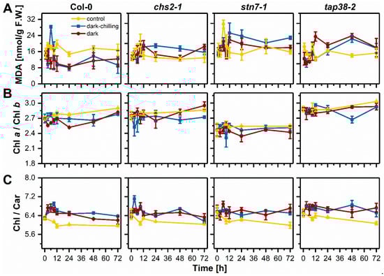 Malondialdehyde (MDA) is the end product of lipid peroxidation, and its content is directly related to the level of membrane damage []. To estimate the influence of dark-chilling and dark conditions on the membrane status, we measured the extent of lipid peroxidation in terms of MDA level (Figure 5A). Under control conditions, the MDA level was relatively stable in all examined lines except for stn7-1, where after 6 h of light, there was a high increase in MDA, which came back to base level after 12 h (8 h of light followed by 4 h of dark) (Figure 5A). Under dark-chilling conditions after 6 h, there was an increase in MDA content in Col-0, which was quickly relaxed—after 12 h of dark-chilling, the MDA level was similar to the level at time 0 h (Figure 5A). In mutants, the MDA level was increasing during the first 12 h, and after 72 h of dark-chilling, it was at least 100% higher compared with Col-0 (Figure 5A). Prolonged dark did not change the MDA level in Col-0, while in mutants, MDA changes in the function of time were similar to those observed for dark-chilling conditions (Figure 5A).