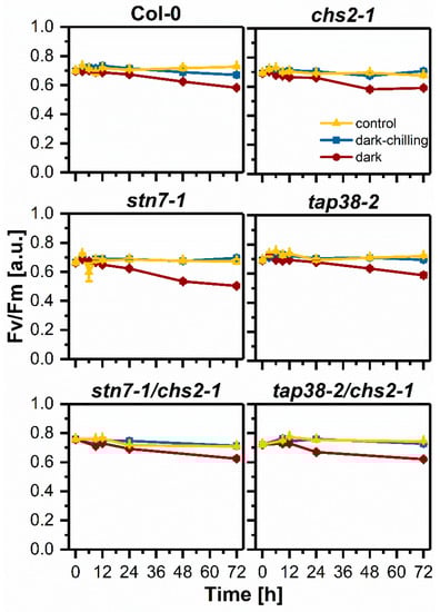Analysis of chlorophyll a fluorescence in vivo in wild-type Col-0, chs2-1, stn7-1, tap38-2, stn7/chs2-1, and tap38/chs2-1 lines of Arabidopsis plants from control, dark-chilling, and dark conditions during three days of the experiment. The FV/FM parameter was measured in leaves adapted to darkness. Data are mean values ± SE from three (dark-chilling and dark) or two (control) independent experiments. Results of statistical analysis (one-way ANOVA with post hoc Tukey test at p = 0.05) are shown in Figure S3.