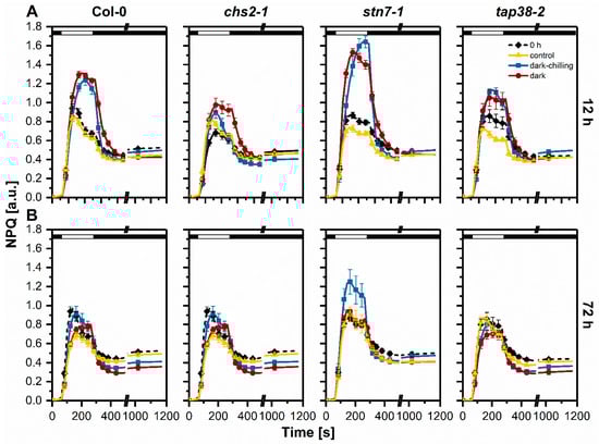 Over 50% increase in NPQ with similar rising kinetics was also observed in the stn7-1 mutant after 12 h of dark-chilling and dark conditions (Figure 7A). After 72 h of dark-chilling, the NPQ decreased but still was higher than in 0 h, while after 72 h in the dark, the NPQ was similar to the control values (Figure 7B). NPQ kinetics in chs2-1 plants did not differ from control conditions in both analyzed time points and experimental conditions (Figure 7A,B). The tap38-2 plants after 12 h exposition to dark-chilling or dark conditions presented an increase in NPQ similar to Col-0 plants, but with lower magnitude (Figure 7A), and after 72 h, there was no differenced compared with control (Figure 7B).